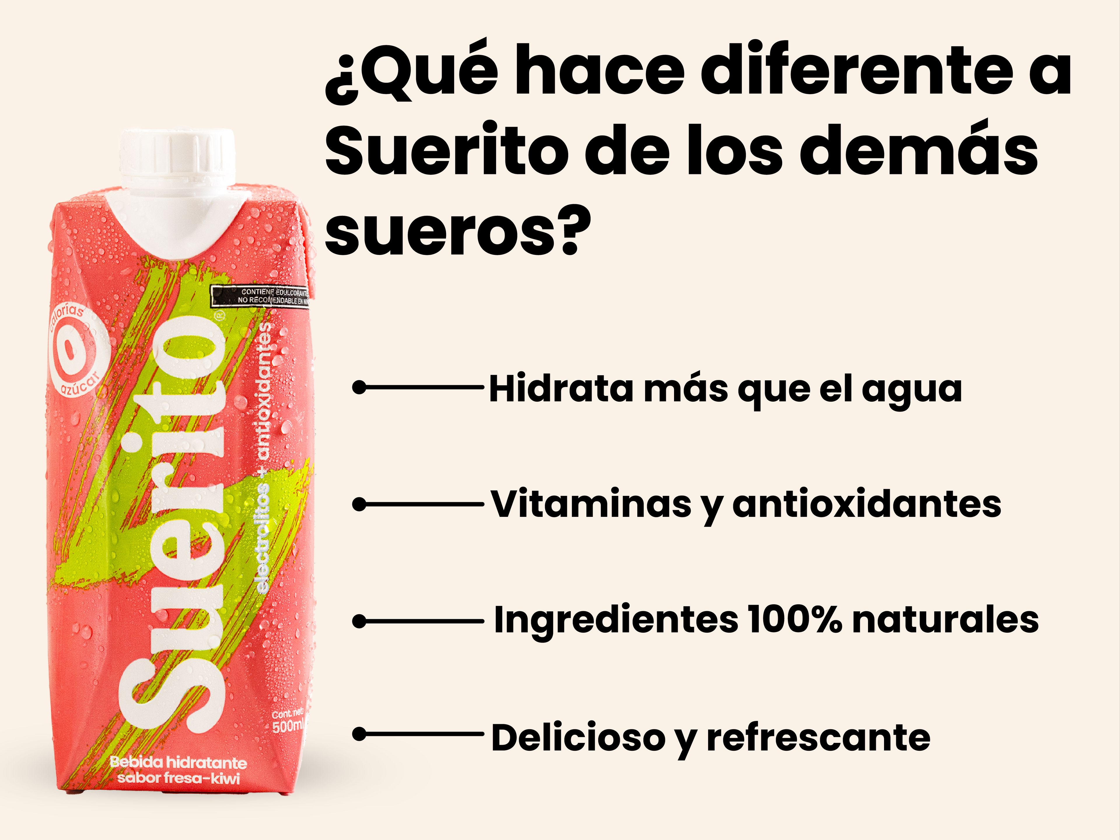 Además de hidratarte, Suerito provee beneficios que van más allá de la hidratación como: fortalecer el sistema inmune, mejorar el rendimiento físico y mental, reduce el estrés y ansiedad, aumento de claridad mental.